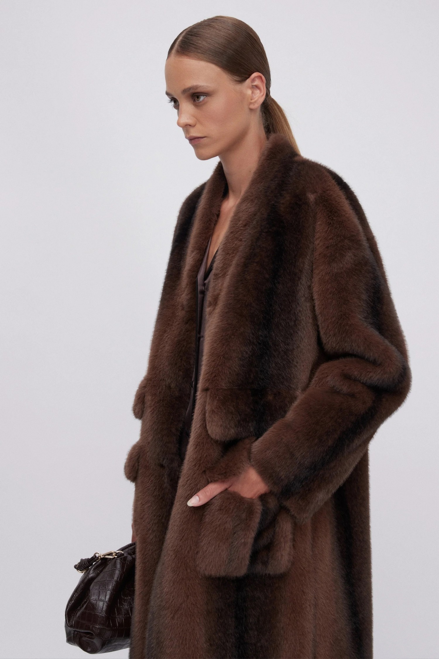 Płaszcz ze sztucznego futra z norek w kolorze czekoladowym. Model z dekoltem w serek, dwiema kieszeniami naszytymi z przodu i miękką podszewką. Zapięcie na zatrzaski.