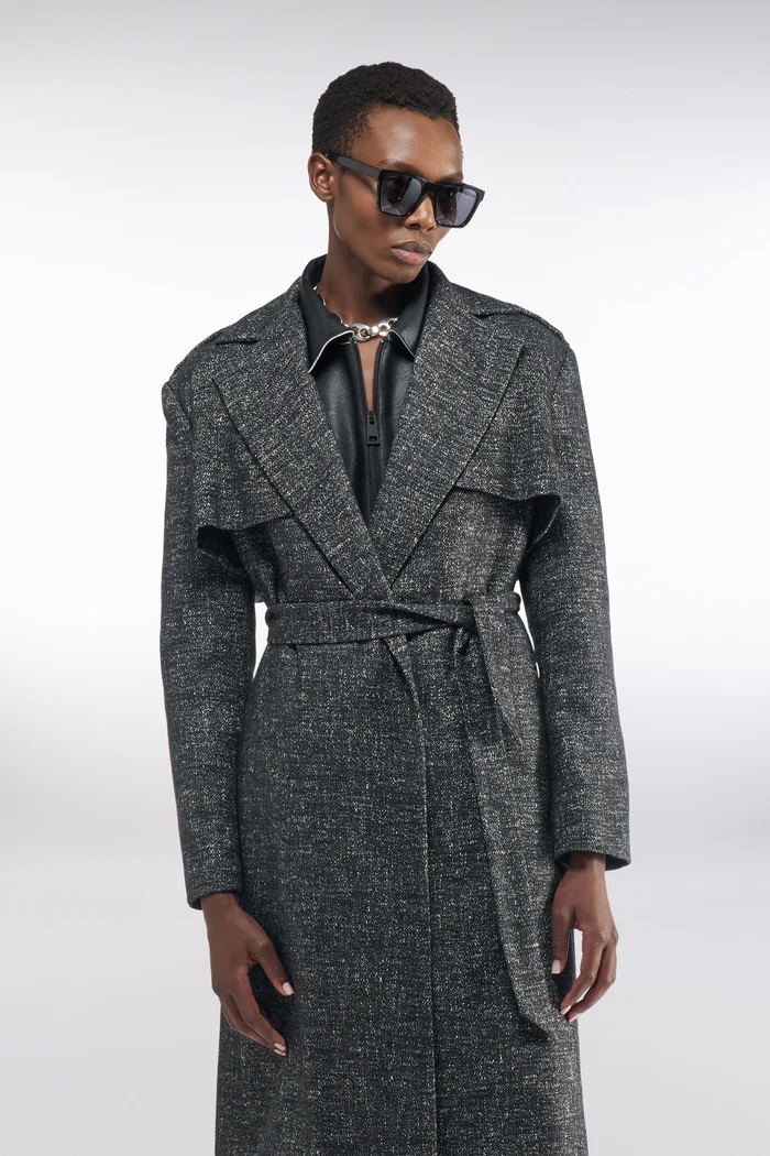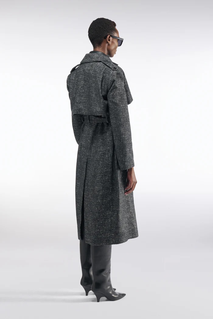 JEDNORZĘDOWY PŁASZCZ Z PALONEGO KASZMIRU I BAWEŁNY, PROSTY KROJONY, Z KOŁNIERZEM Z KLAPY, PAPIERAMI NA RAMIĄCZKI, ZAPIĘCIEM NA JEDNEGO GUZIKA. PASEK W KOŁNIERZU, KIESZENIE SKOŚNE Z KLAPSĄ I CENTRALNYM ROZCIĘCIEM Z TYŁU. DŁUGOŚĆ DO KOLAN.