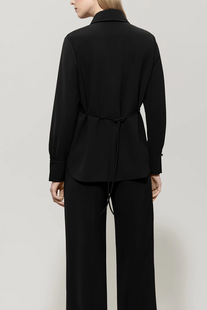 Bluzka koszulowa wykonana z lejącej, elastycznej techno-crepe o klasycznym kroju z kołnierzykiem koszulowym i krytym zapięciem na guziki. Wiązana tasiemka z frędzlami przy kołnierzyku i tasiemka w talii dopełniają całości.