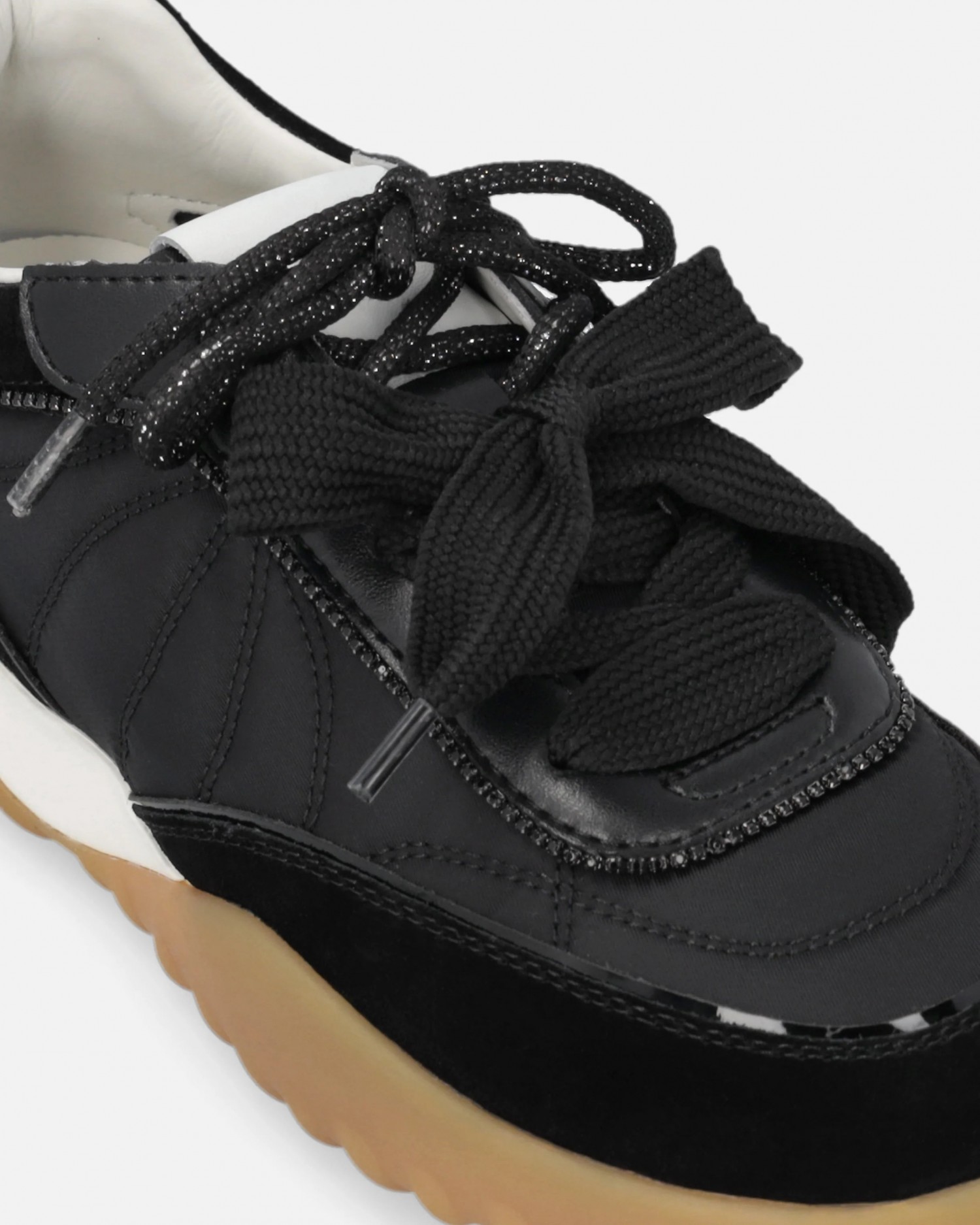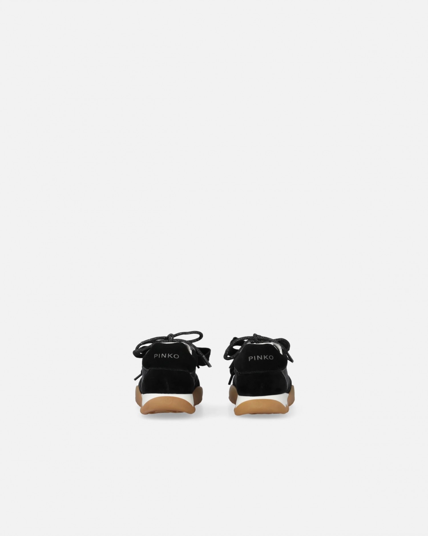 Sneakersy z zamszu i tkaniny technicznej wykończone, błyszczącą lamówką w tym samym odcieniu na przyszwie oraz lamówką z mini ćwiekami wzdłuż całej maski. Oprócz klasycznych płaskich sznurowadeł model jest wzbogacony podwójną wersją sznurowadeł: z detalami graficznymi lub z błyszczącym wykończeniem, które wprowadza subtelny świetlisty akcent. Na języczku znajduje się napis z logo PINKO, a wygodna, dwukolorowa, gumowa podeszwa uzupełniona jest wytłoczonym na całej powierzchni logo Love Birds. Idealny model dla tych, które kochają wyróżniać się ze stylem, ale bez poświęcania praktyczności