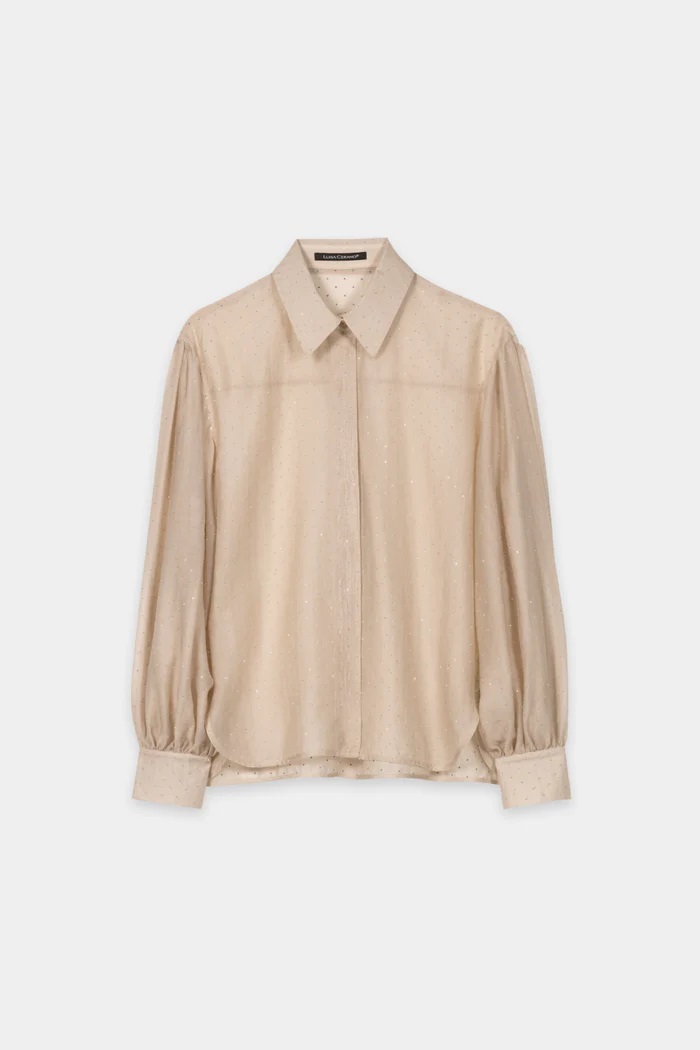 Delikatnie prześwitująca bluzka wykonana z mieszanki lyocellu z eleganckim połyskującym wykończeniem z błyszczących kamieni i ukrytym zapięciem na guziki. Plisa z tyłu i rozcięcie z boku zapewniają swobodny krój.