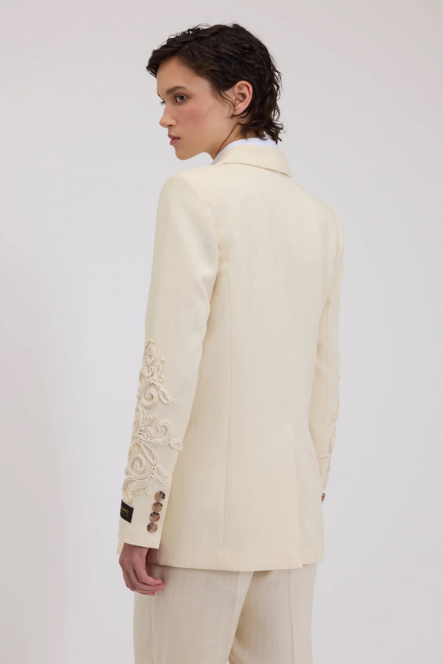 Dwurzędowa marynarka z mieszanki lnu w jodełkę, w jednolitym kolorze, ze strukturalnymi ramionami i klapami w szpic, ozdobiona haftem kordonkowym na rękawach i lewym boku. Metka krawiecka na rękawie.
