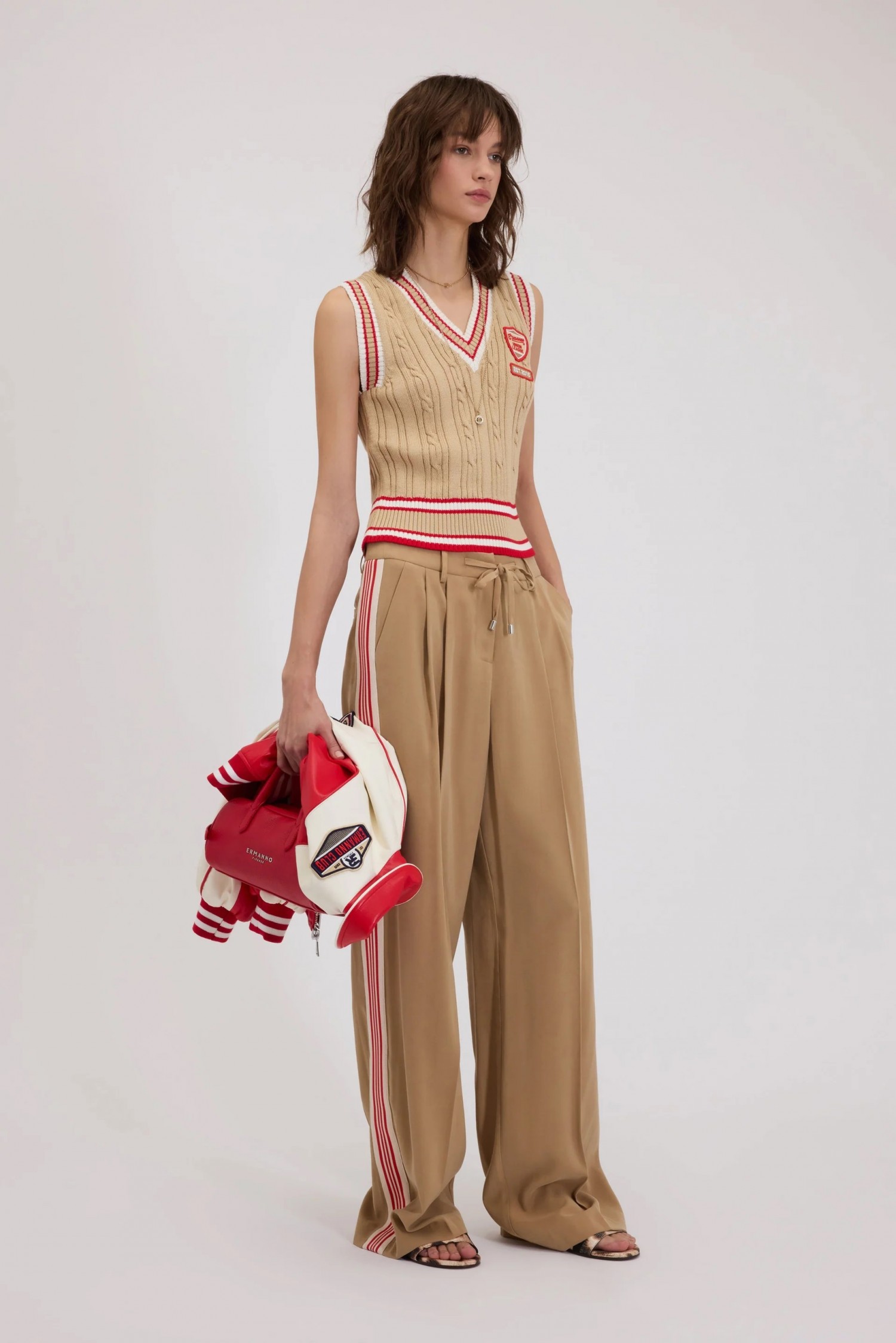 Spodnie cady z wiskozy z zakładkami z przodu i lampasem z boku. Pas z wewnętrznym haftem i sznurkiem ściągającym z metalowymi końcówkami. Kieszenie boczne i haftowane logo z tyłu.