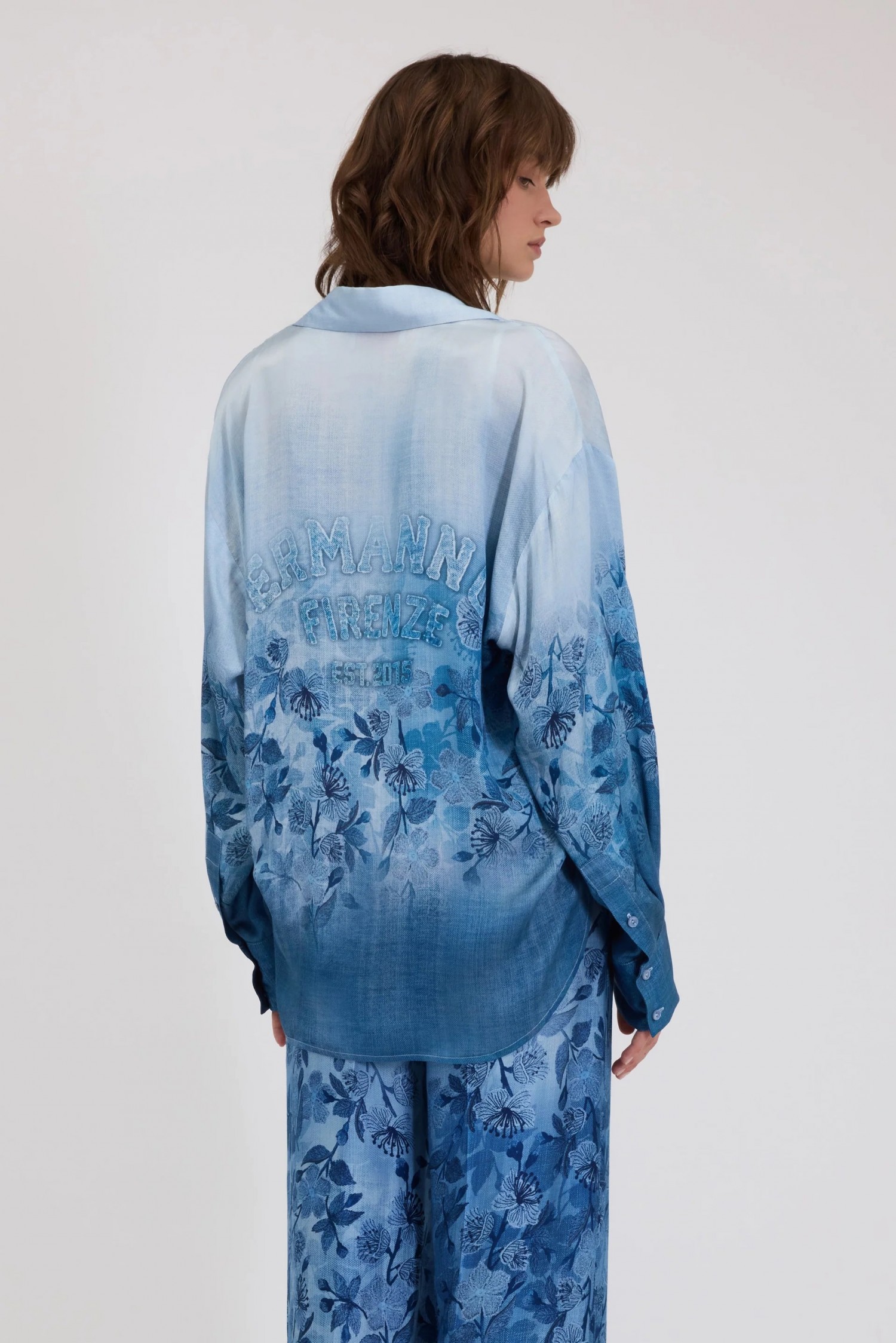 Koszula z satyny wiskozowej z nadrukiem w kwiaty i cieniowanym denimowym wzorem. Nadruk z logo z tyłu. Luźny krój o męskiej objętości.