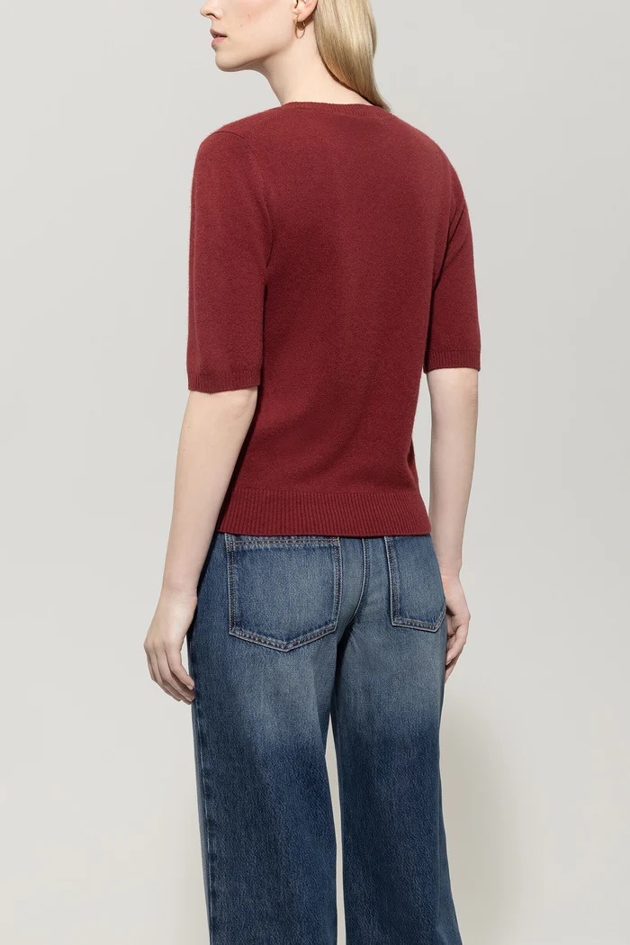Sweter z cienkiej dzianiny wykonany z mieszanki wełny ze szczególnie miękkim kaszmirem. Minimalistyczny design obejmuje okrągły dekolt, rękawy o średniej długości i delikatne prążkowane mankiety przy dekolcie, u dołu i przy rękawach.