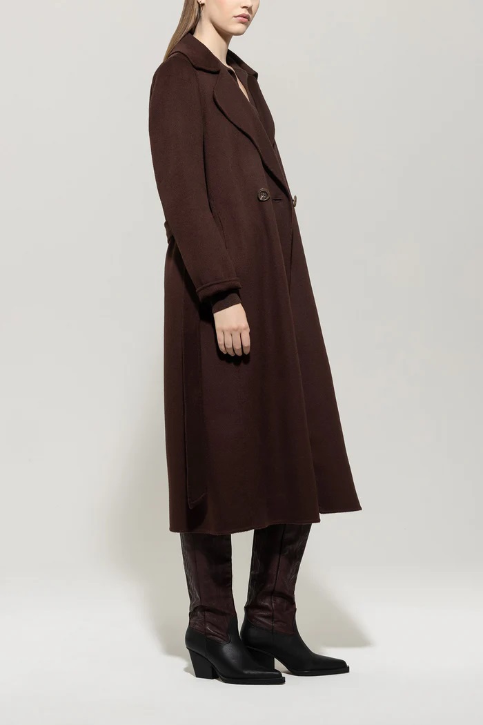 Długi płaszcz wykonany z luksusowej mieszanki wełny i kaszmiru z wysokiej jakości dwustronnym wykończeniem. Płaszcz ma wąski krój i zapięcie na dwa guziki, boczne kieszenie i wiązany pasek w talii.
