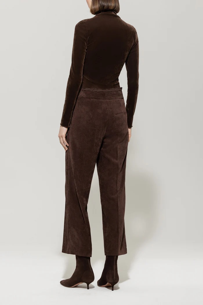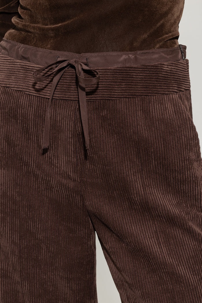 Przycięte spodnie do joggingu wykonane z miękkiego, lejącego sztruksu z szeroką nogawką. Wersja z podwójnym paskiem w talii ma sznurek do indywidualnej regulacji szerokości.