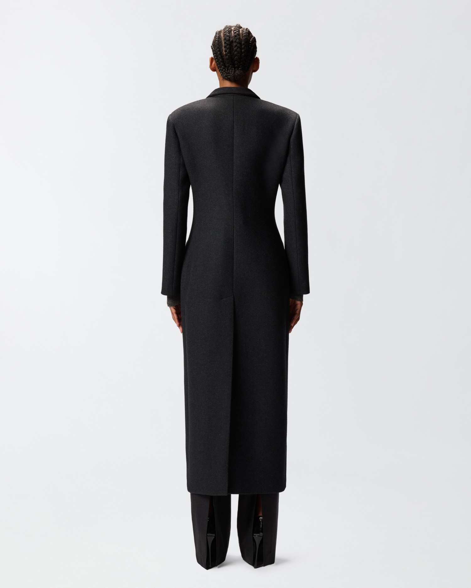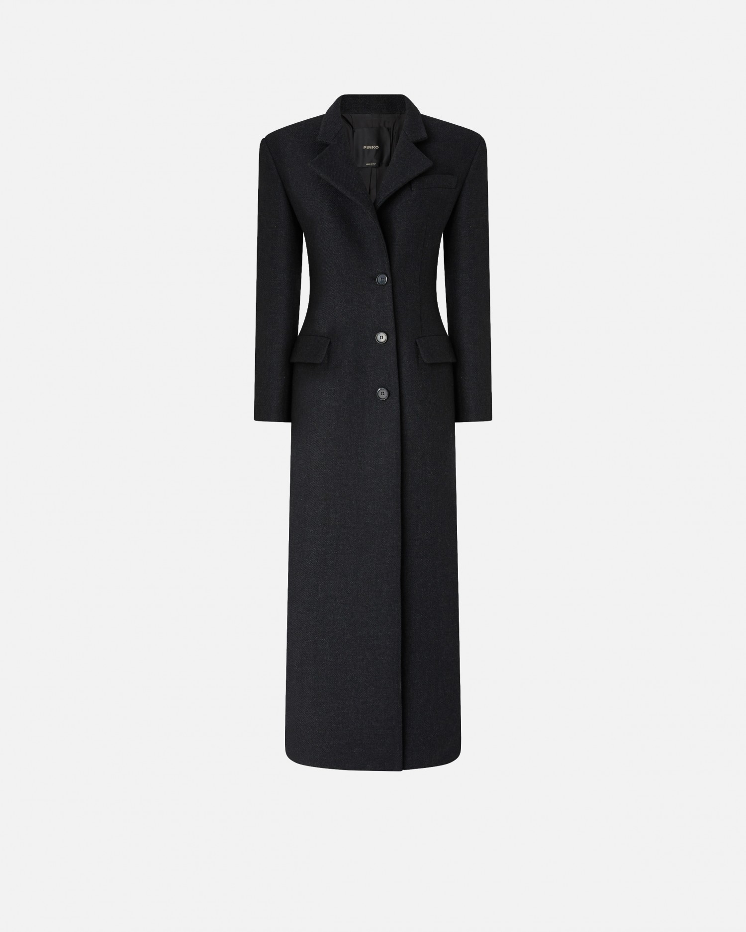 Długi płaszcz jednorzędowy o dopasowanej na bokach linii, z klapami, mocno podkreślonymi ramionami i kieszeniami z klapką, uszyty z miękkiego sukna z mieszanki wełny. Długi, asymetryczny krój z tyłu i przesunięte na bok zapięcie na guziki z przodu stanowią nową interpretację klasycznego wzoru, dzięki czemu powstaje minimalistyczny, ale elegancki model w pełnym stylu PINKO, z potencjałem na nowy must-have w zimowym sezonie.