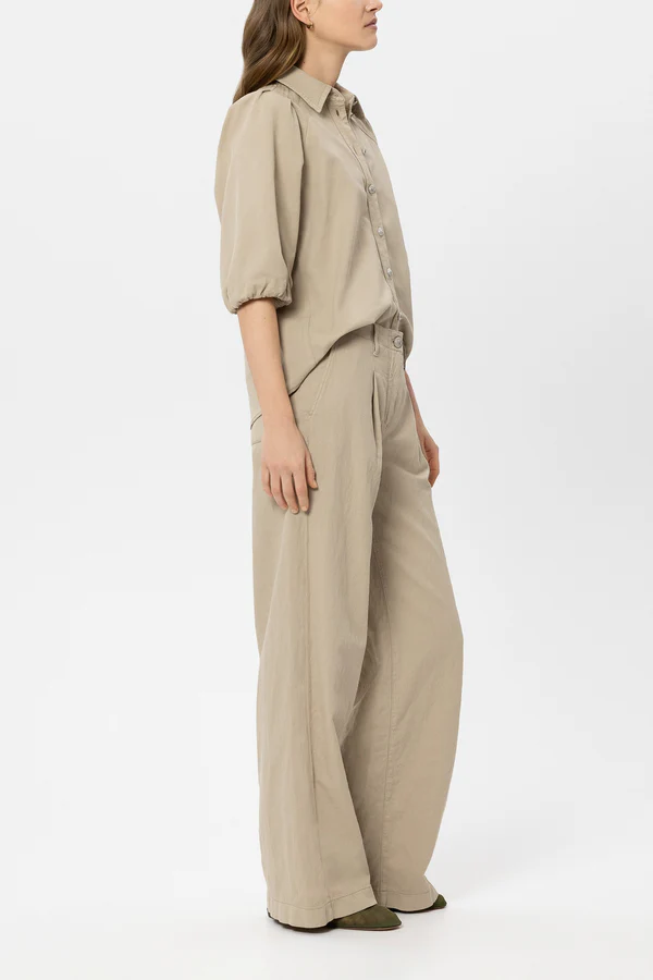 Spodnie z szerokimi nogawkami w stylu denim z lekkim efektem rozciągania. Całości dopełniają zakładki i ozdobne metalowe guziki.