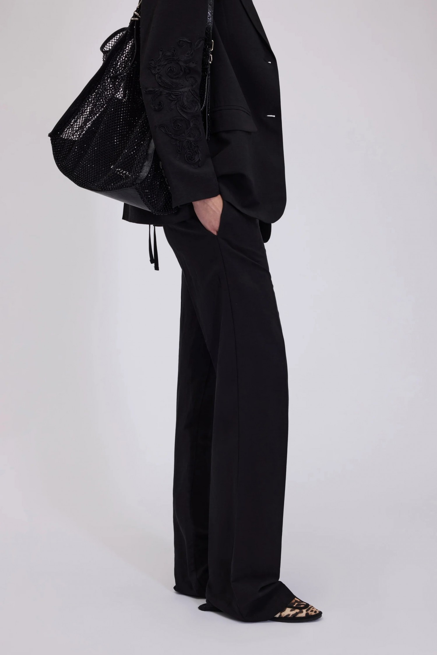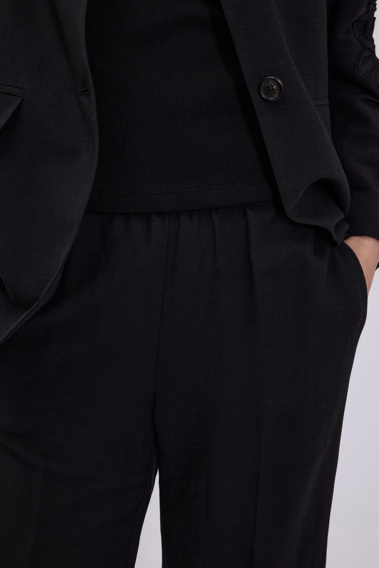 Eleganckie spodnie z mieszanki lnu z prostymi nogawkami. Miękki krój, elastyczny pas z logo i zaprasowany kant.